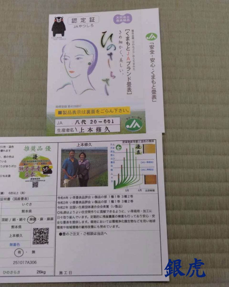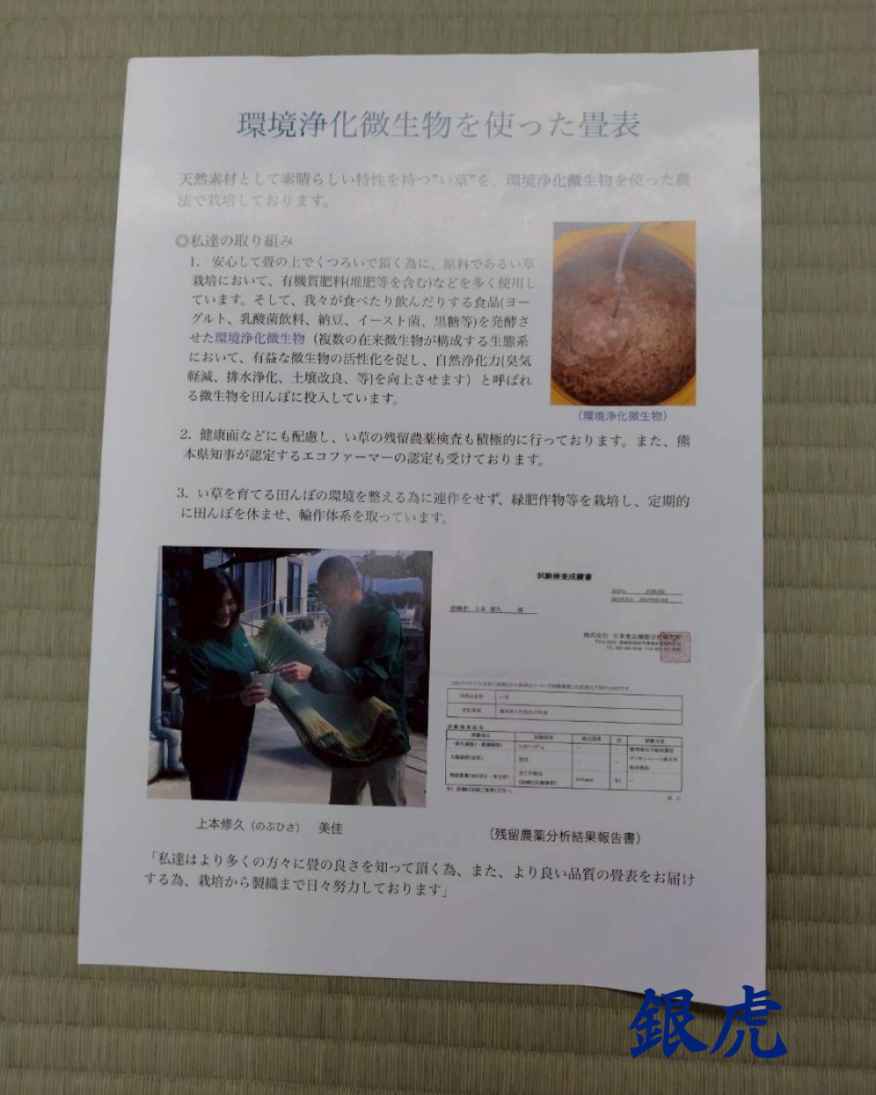 上本さんの畳表は「環境浄化微生物を使った畳表」であり、老若男女誰にとっても優しい畳表です。「畳の良さを知っていただきたい・より良い品質の天然い草の畳表を安心して使っていただきたい」といったお客様への想いが込められています。
