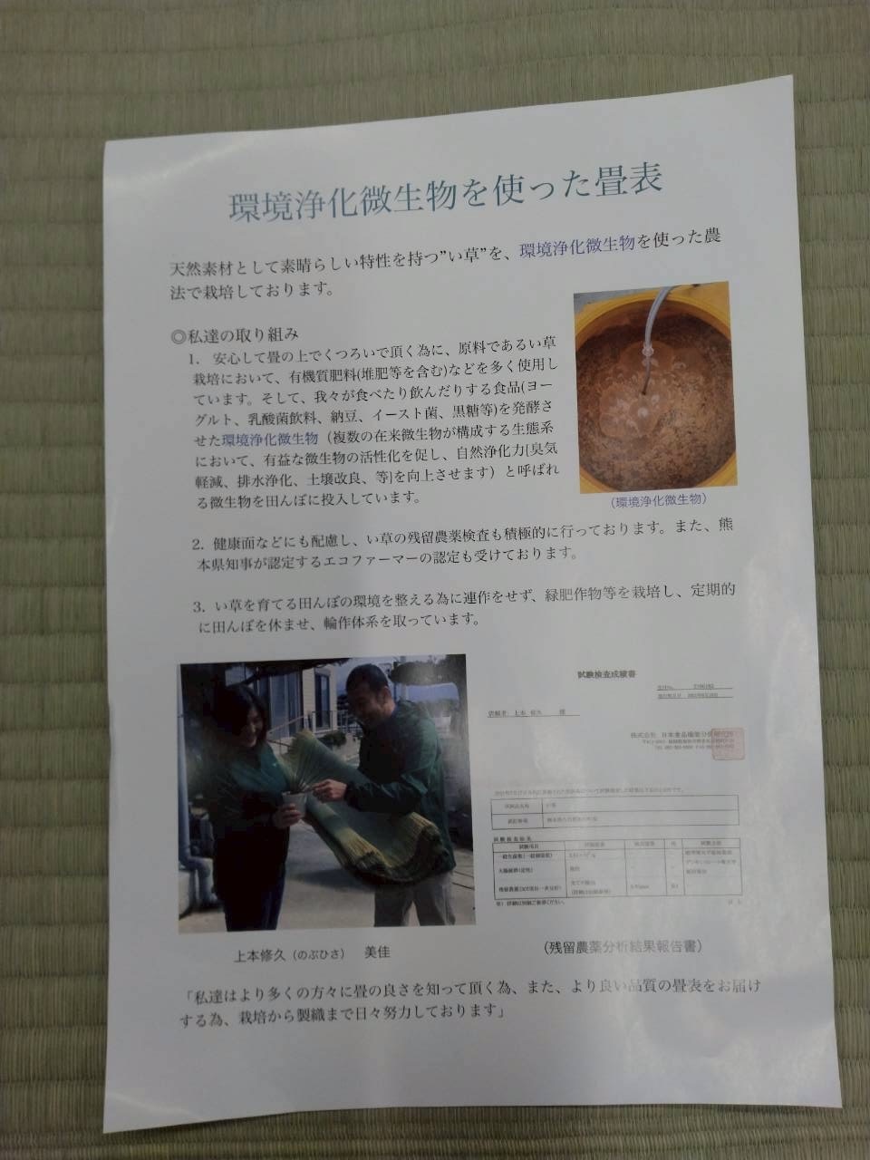 上本さんの畳表は「環境浄化微生物を使った畳表」であり、老若男女誰にとっても優しい畳表です。「畳の良さを知っていただきたい・より良い品質の天然い草の畳表を安心して使っていただきたい」といったお客様への想いが込められています。