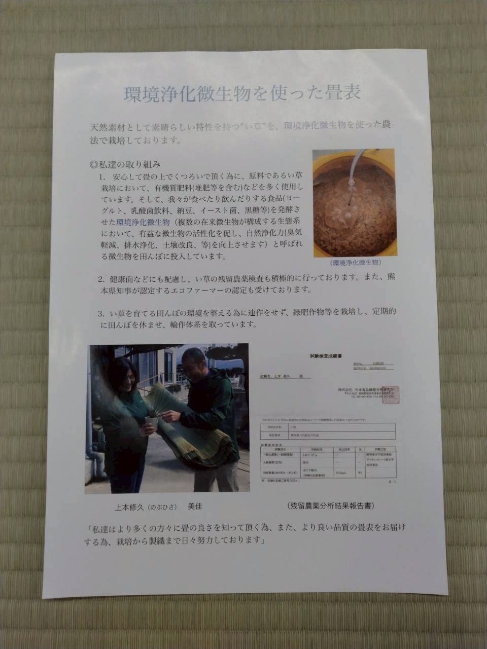 上本さんの畳表は「環境浄化微生物を使った畳表」であり、老若男女誰にとっても優しい畳表です。「畳の良さを知っていただきたい・より良い品質の天然い草の畳表を安心して使っていただきたい」といったお客様への想いが込められています。