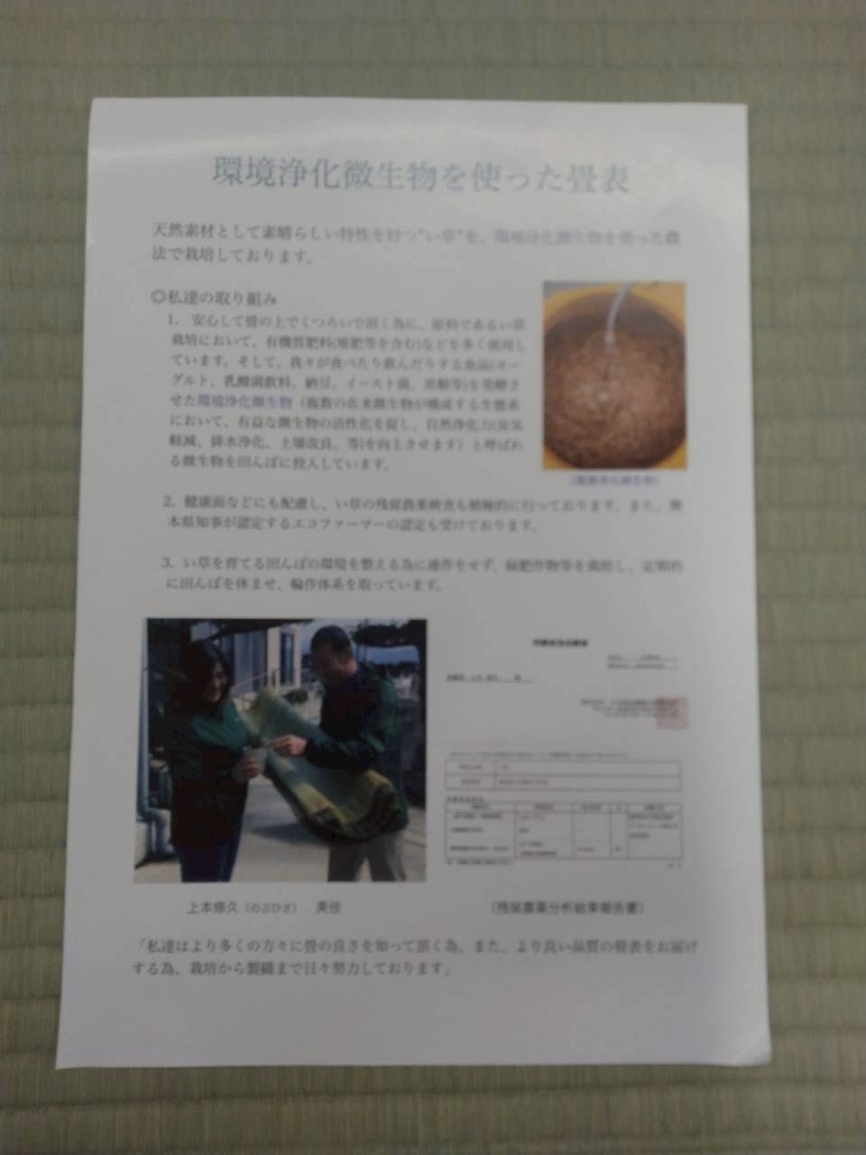 上本さんの畳表は「環境浄化微生物を使った畳表」であり、老若男女誰にとっても優しい畳表です。「畳の良さを知っていただきたい・より良い品質の天然い草の畳表を安心して使っていただきたい」といったお客様への想いが込められています。