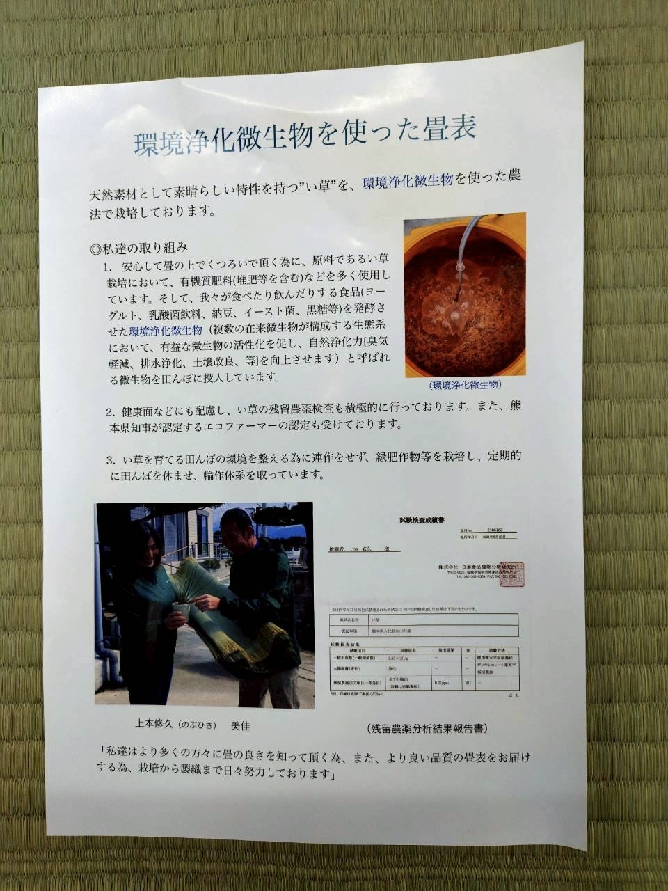 上本さんの畳表は「環境浄化微生物を使った畳表」であり、老若男女誰にとっても優しい畳表です。「畳の良さを知っていただきたい・より良い品質の天然い草の畳表を安心して使っていただきたい」といったお客様への想いが込められています。