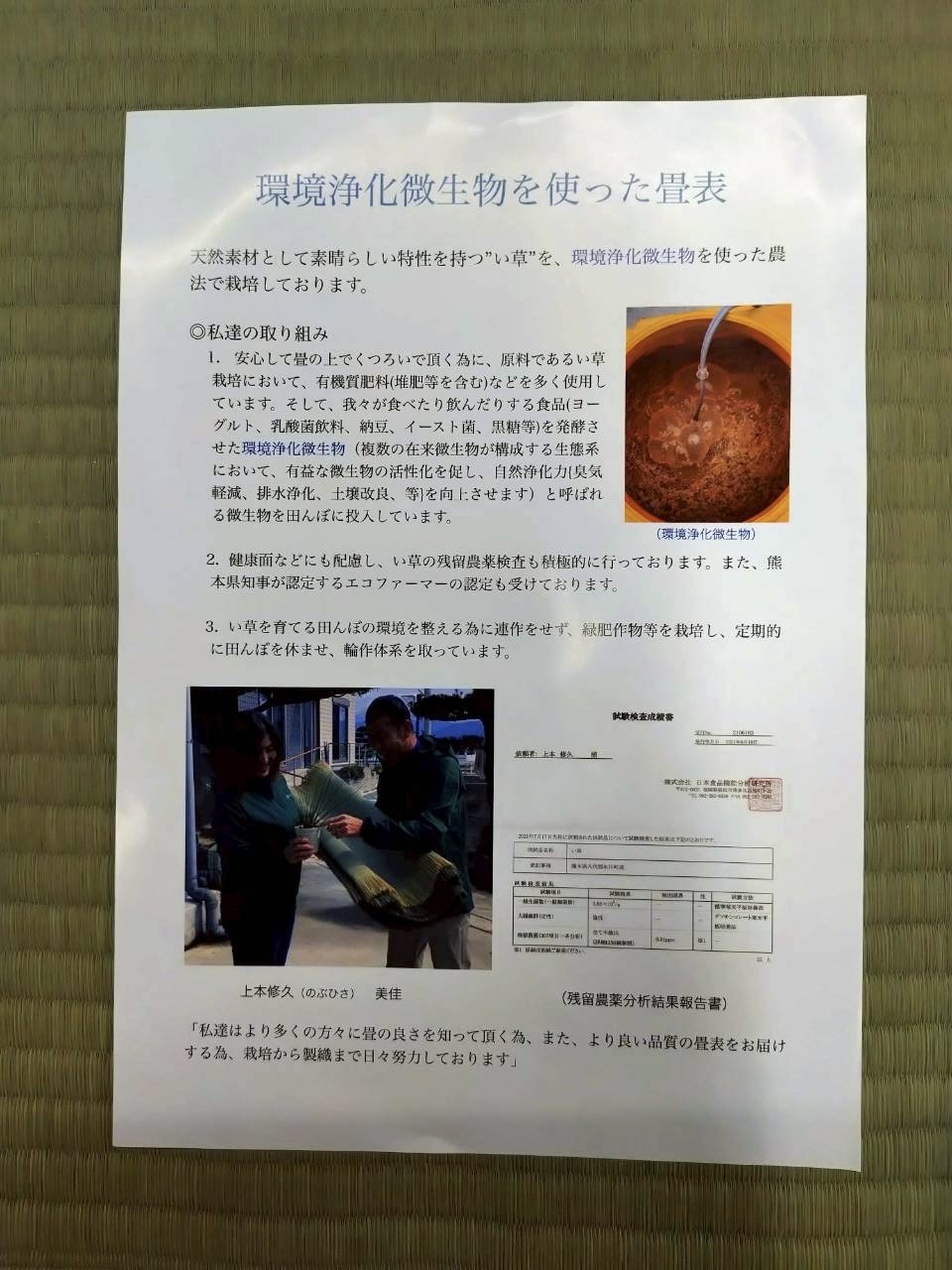 上本さんの畳表は「環境浄化微生物を使った畳表」であり、老若男女誰にとっても優しい畳表です。「畳の良さを知っていただきたい・より良い品質の天然い草の畳表を安心して使っていただきたい」といったお客様への想いが込められています。