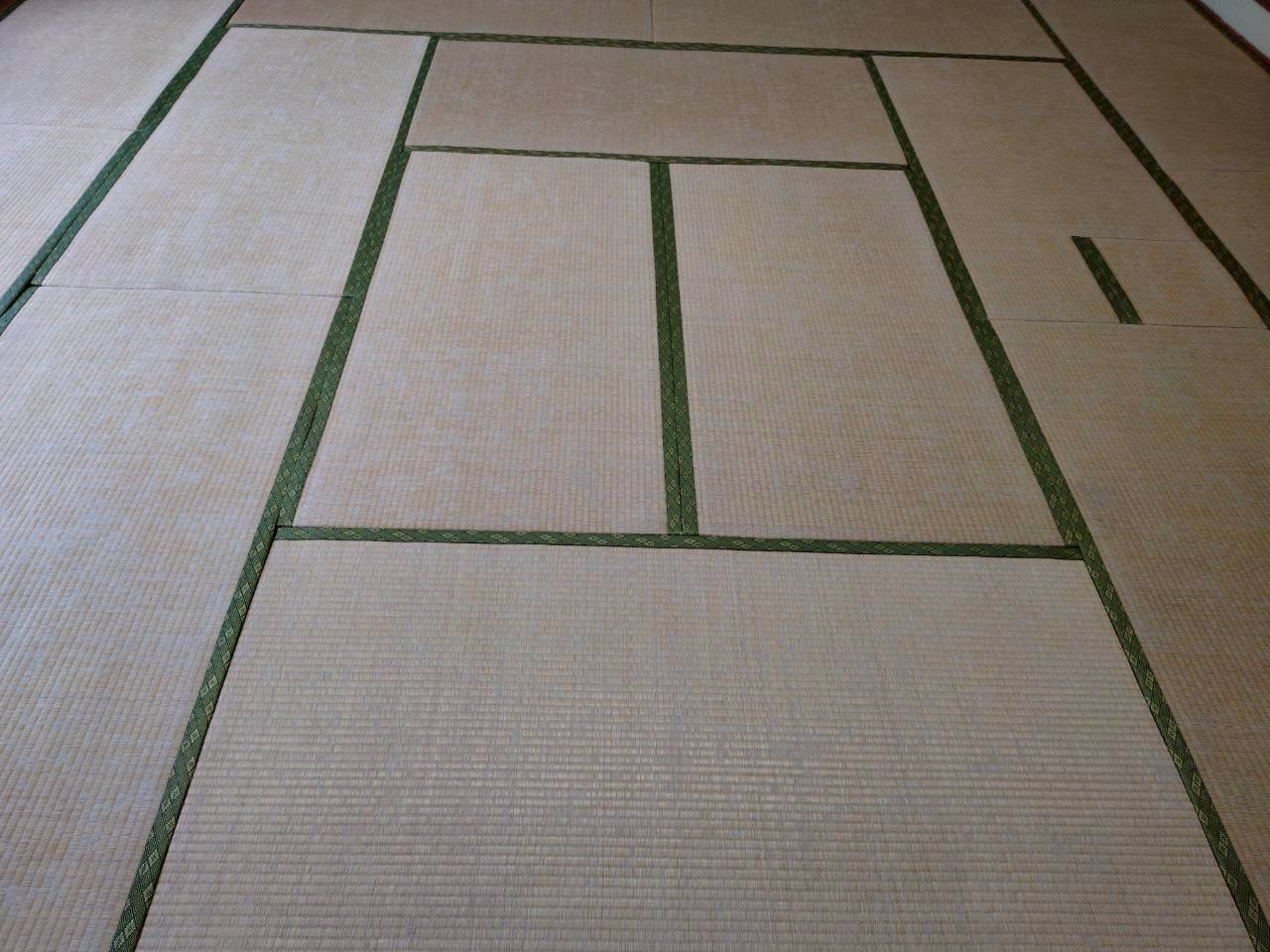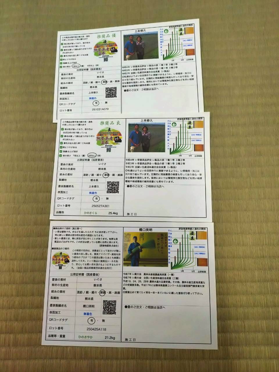 そこで、銀虎より品質は申し分ないが、見本で使用していた畳表や、自然のものの特性でもあるのですが、どうしても他の畳と色味があわなかったりするもの(このような畳は、一般のご家庭の施工には使用できない材料になります)をミックスして使用させていただく事をご提案させていただきました。